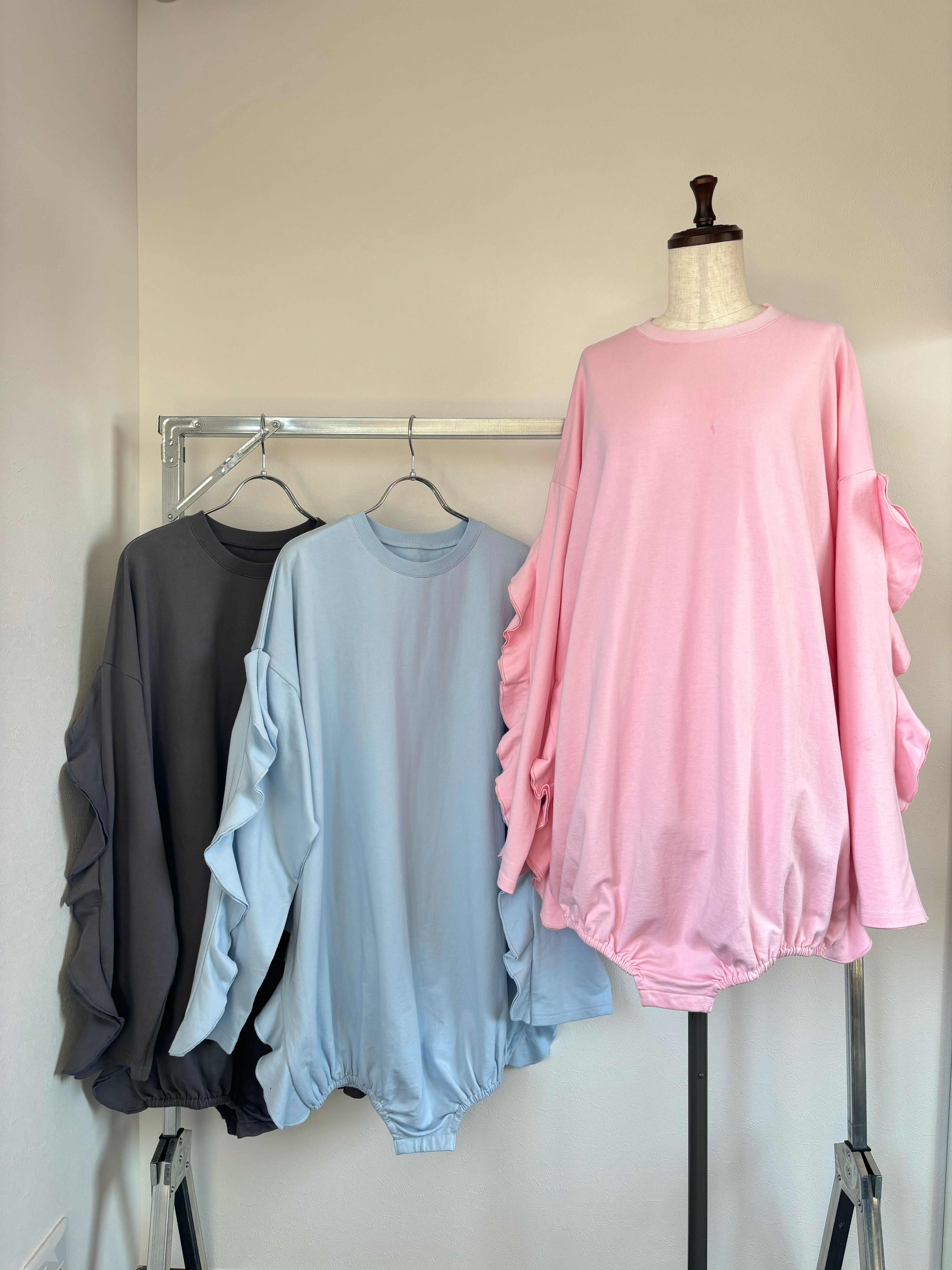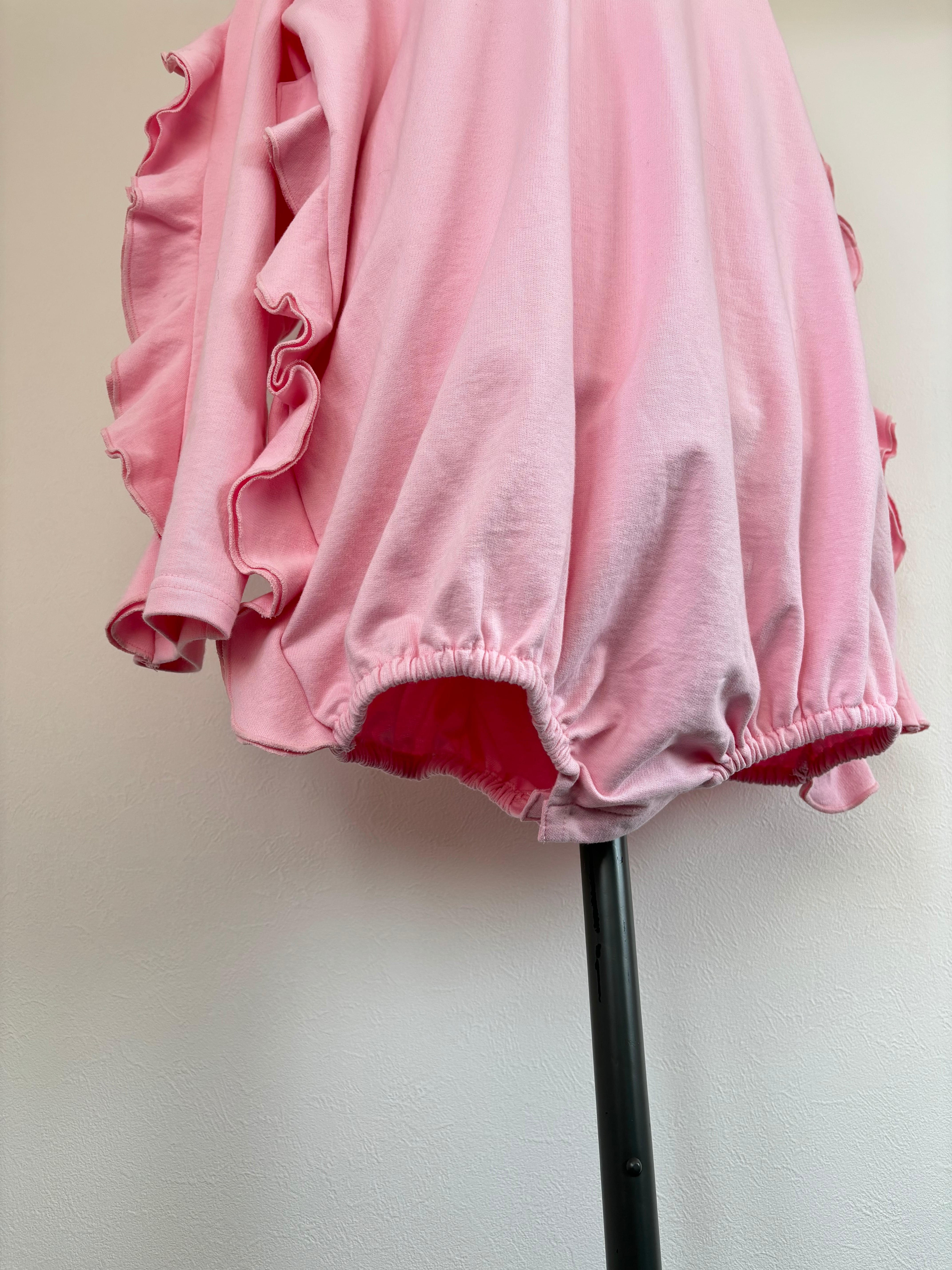 袖部分と、脇部分のフリルと、裾がロンパース型になったキャッチーな一着。