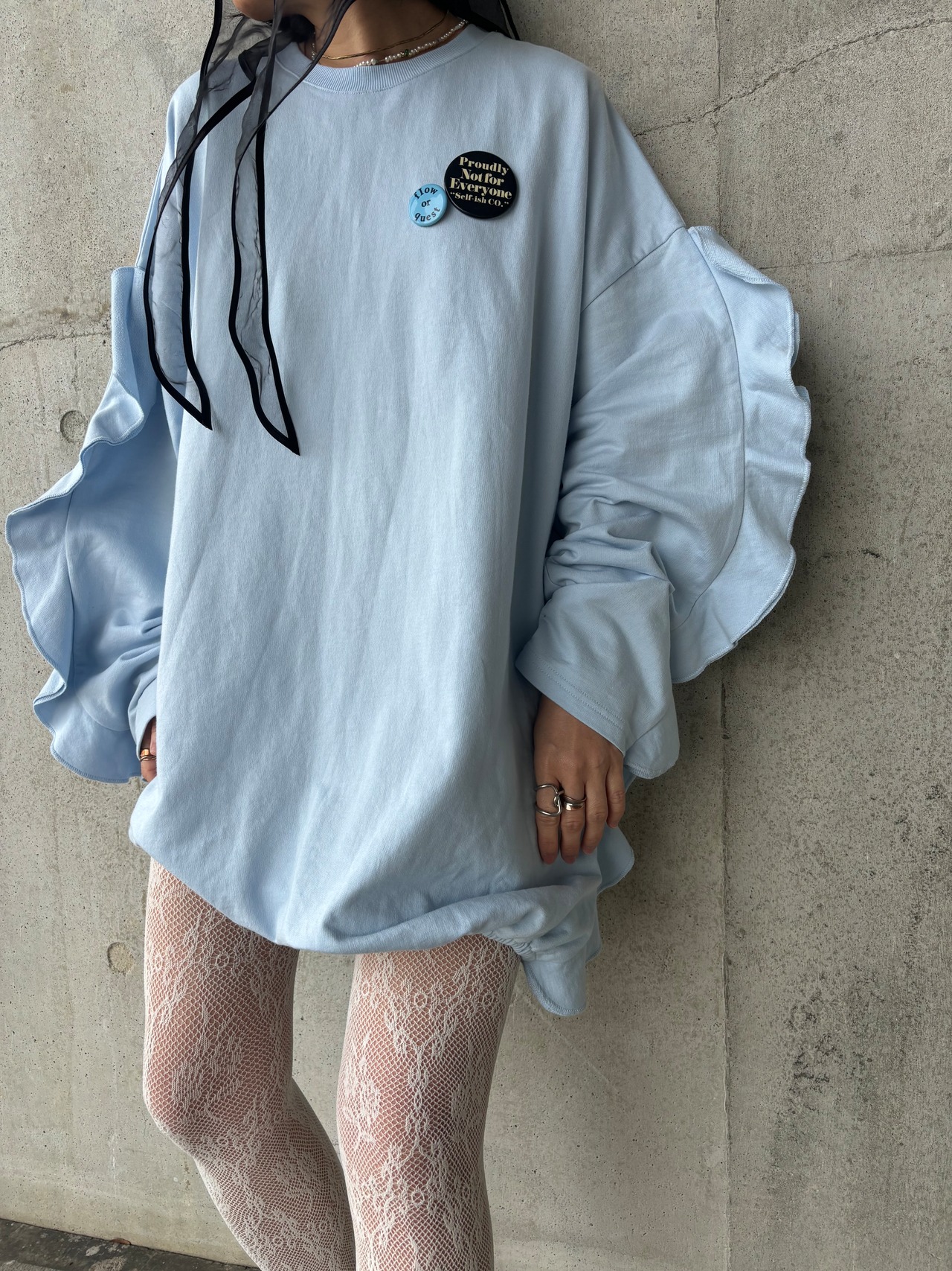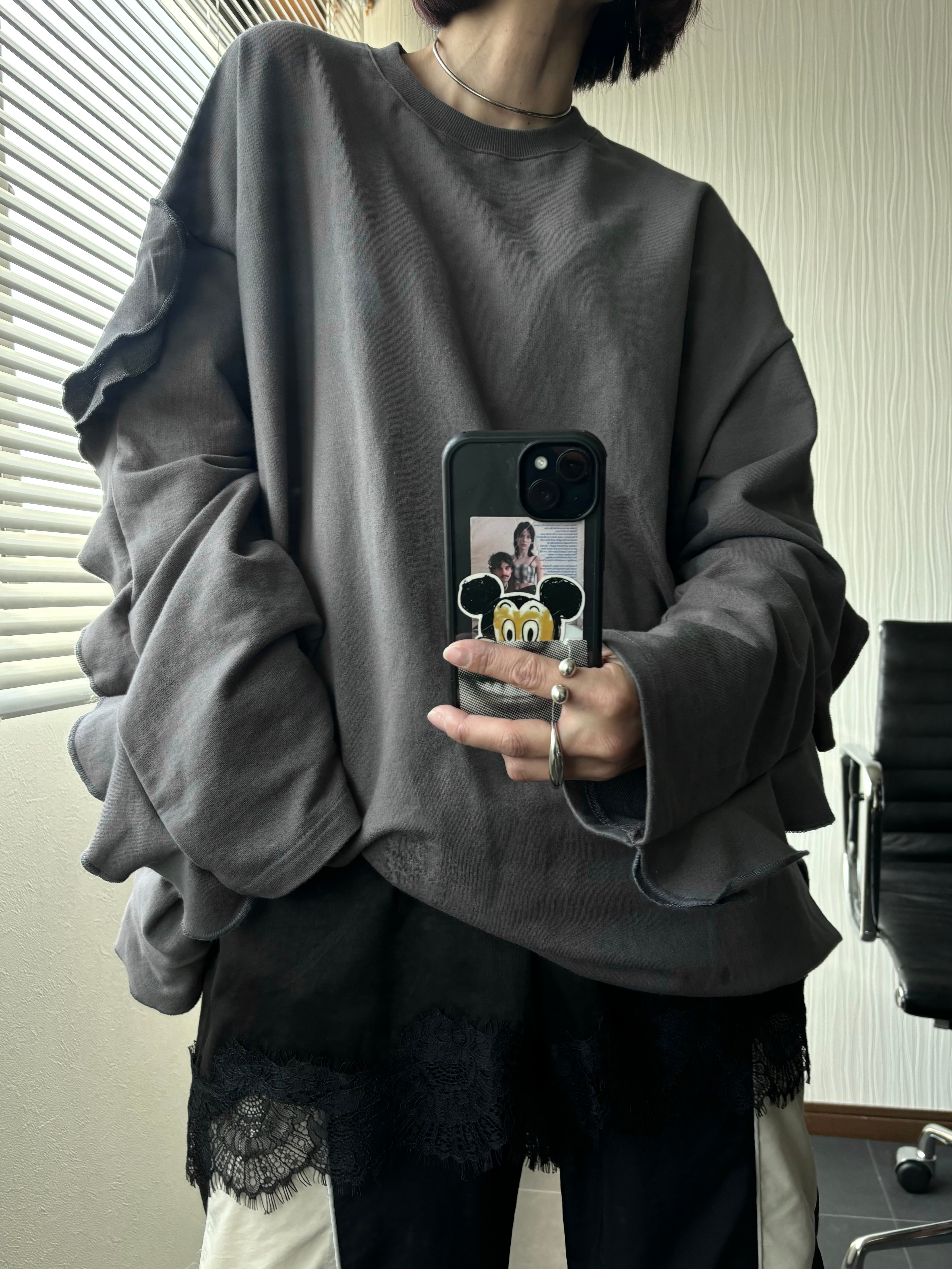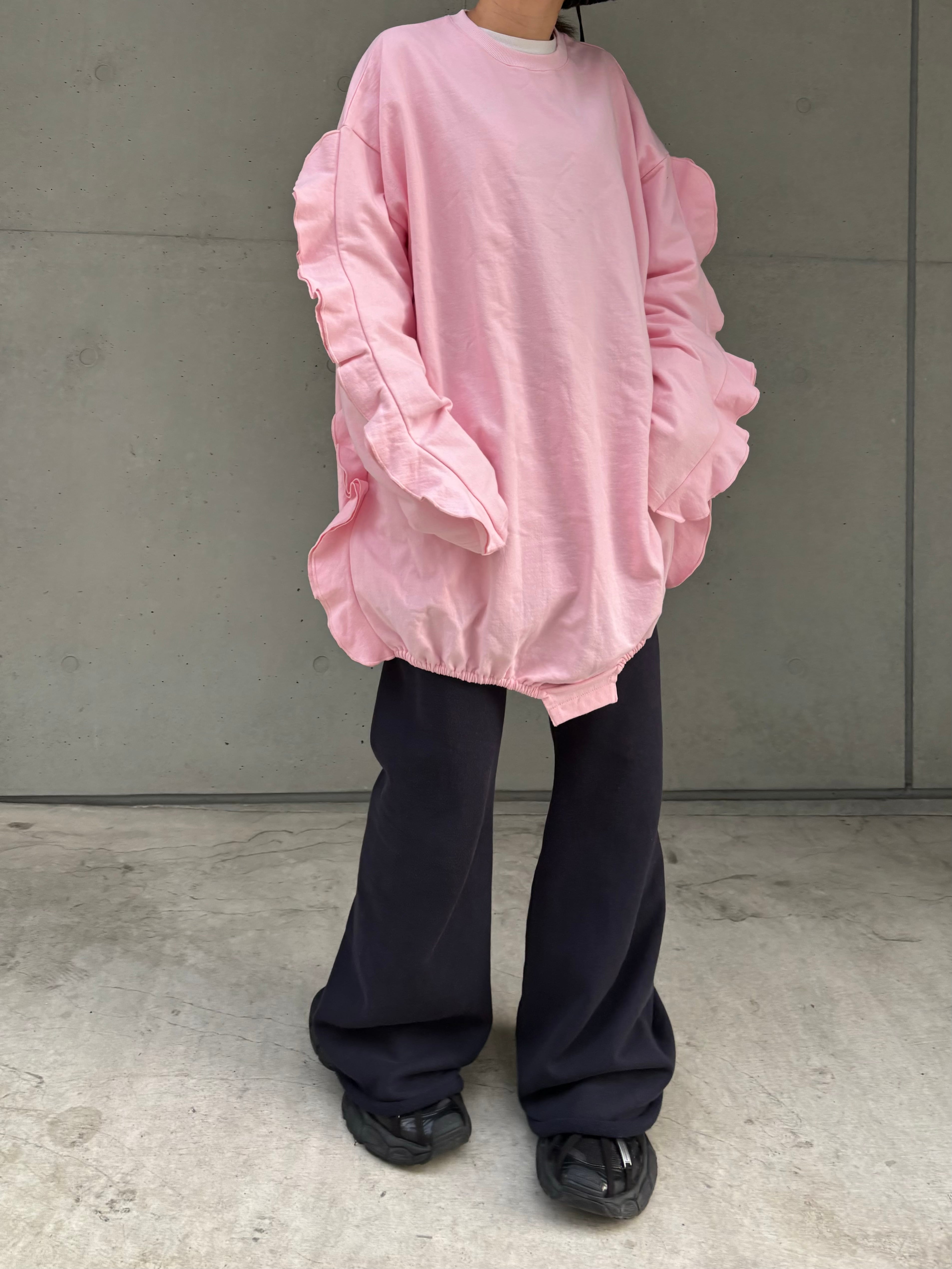 フリルデザインが女性らしい印象のオーバースウェット。
