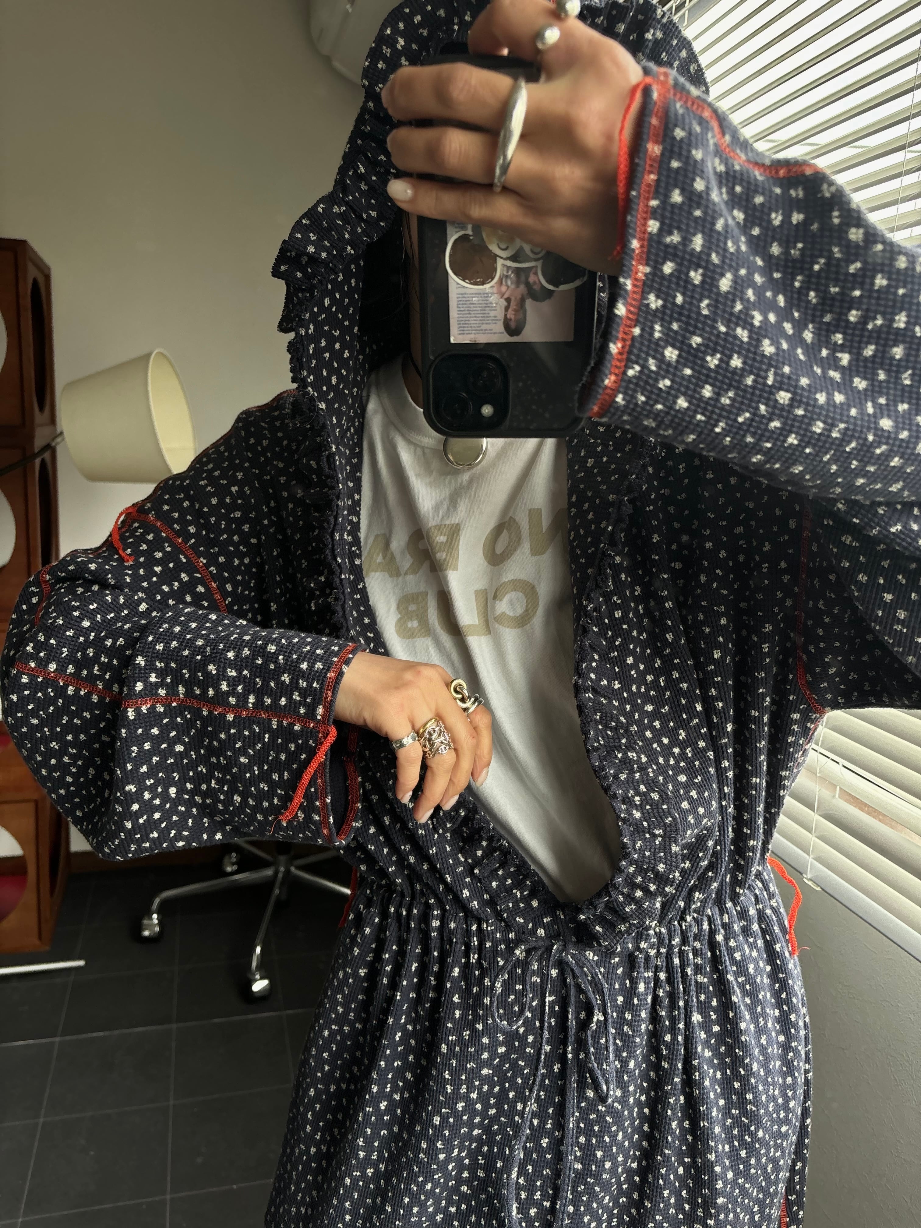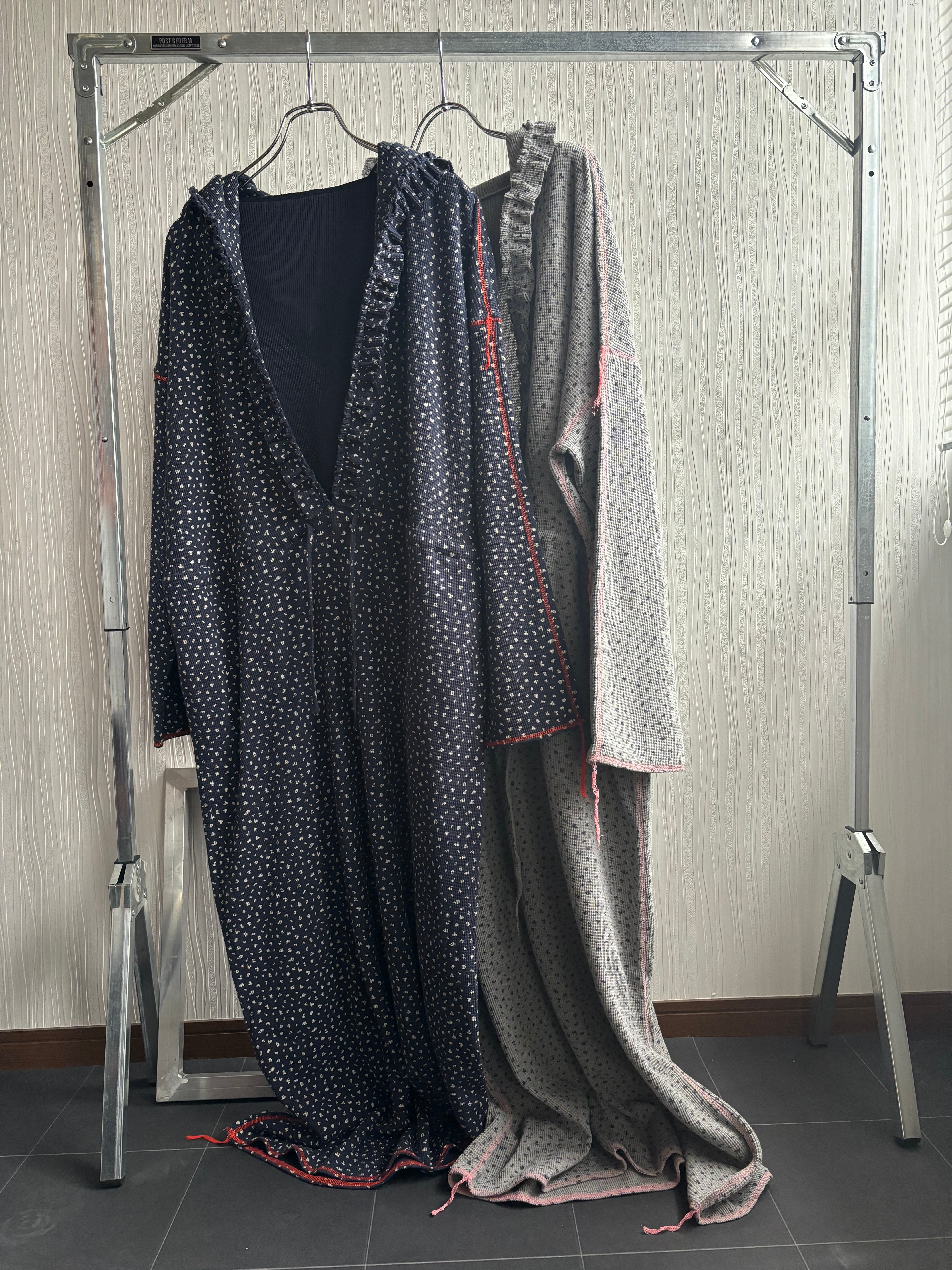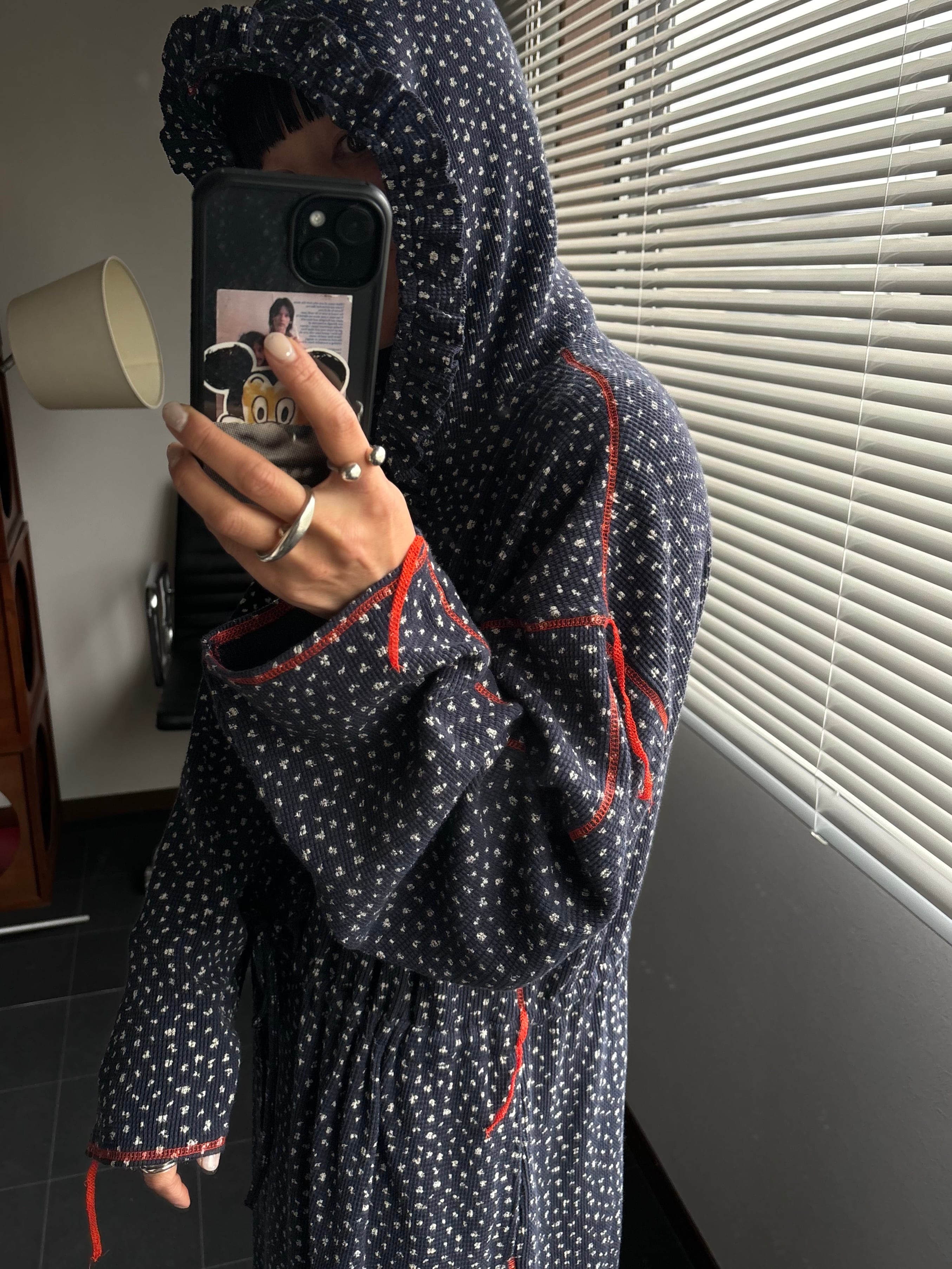 抽象的な柄とカラーステッチが特徴のロングワンピース。