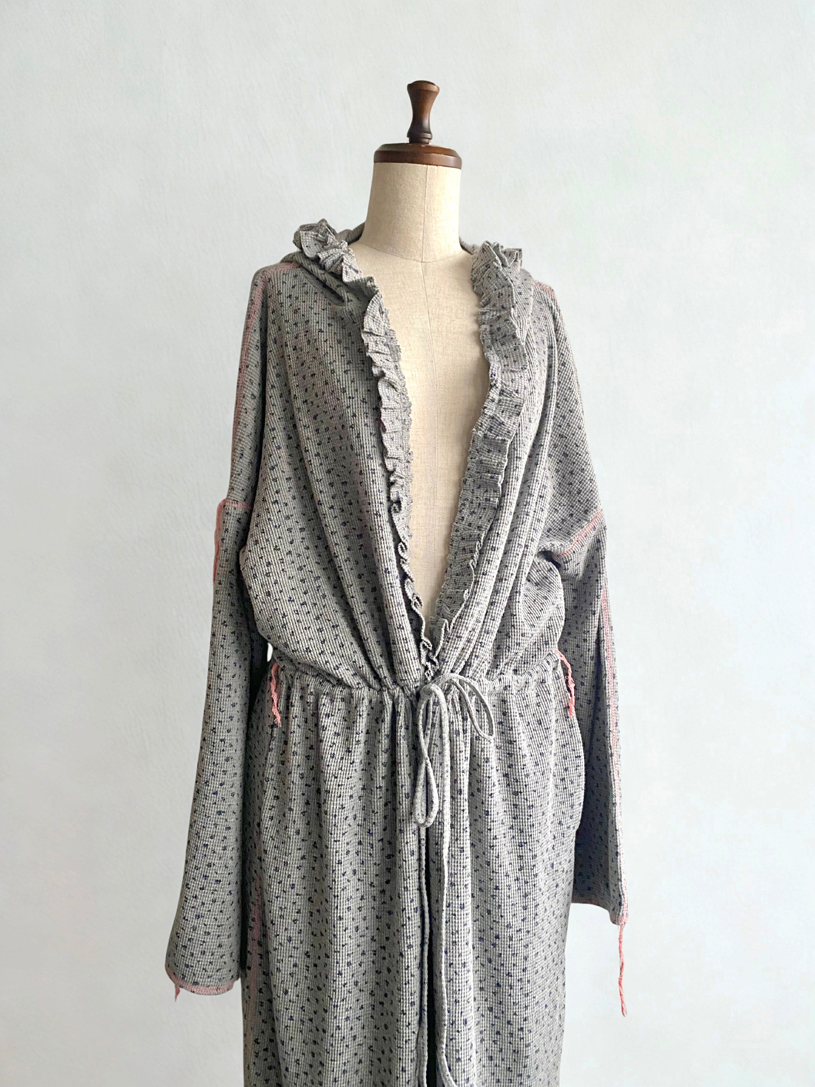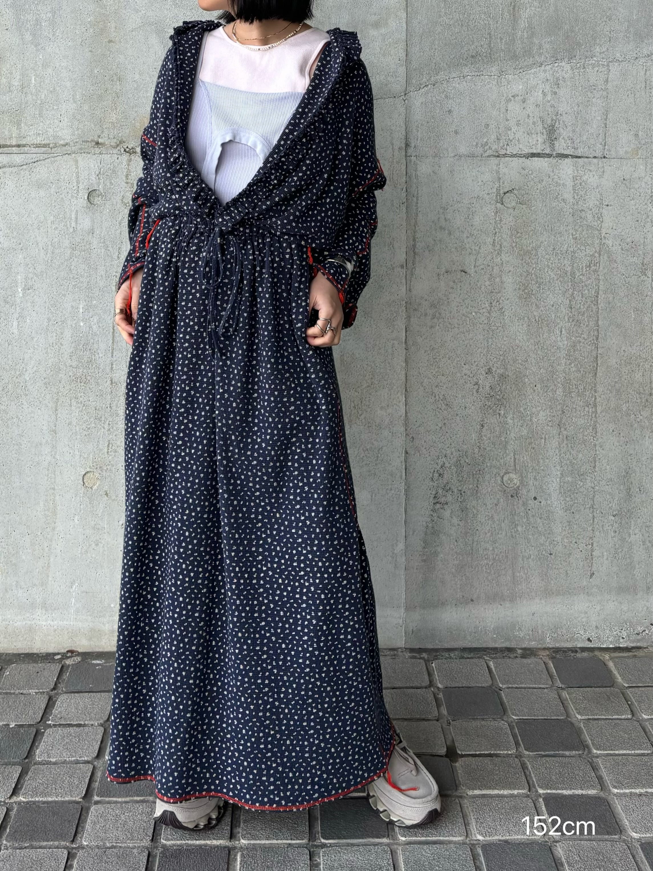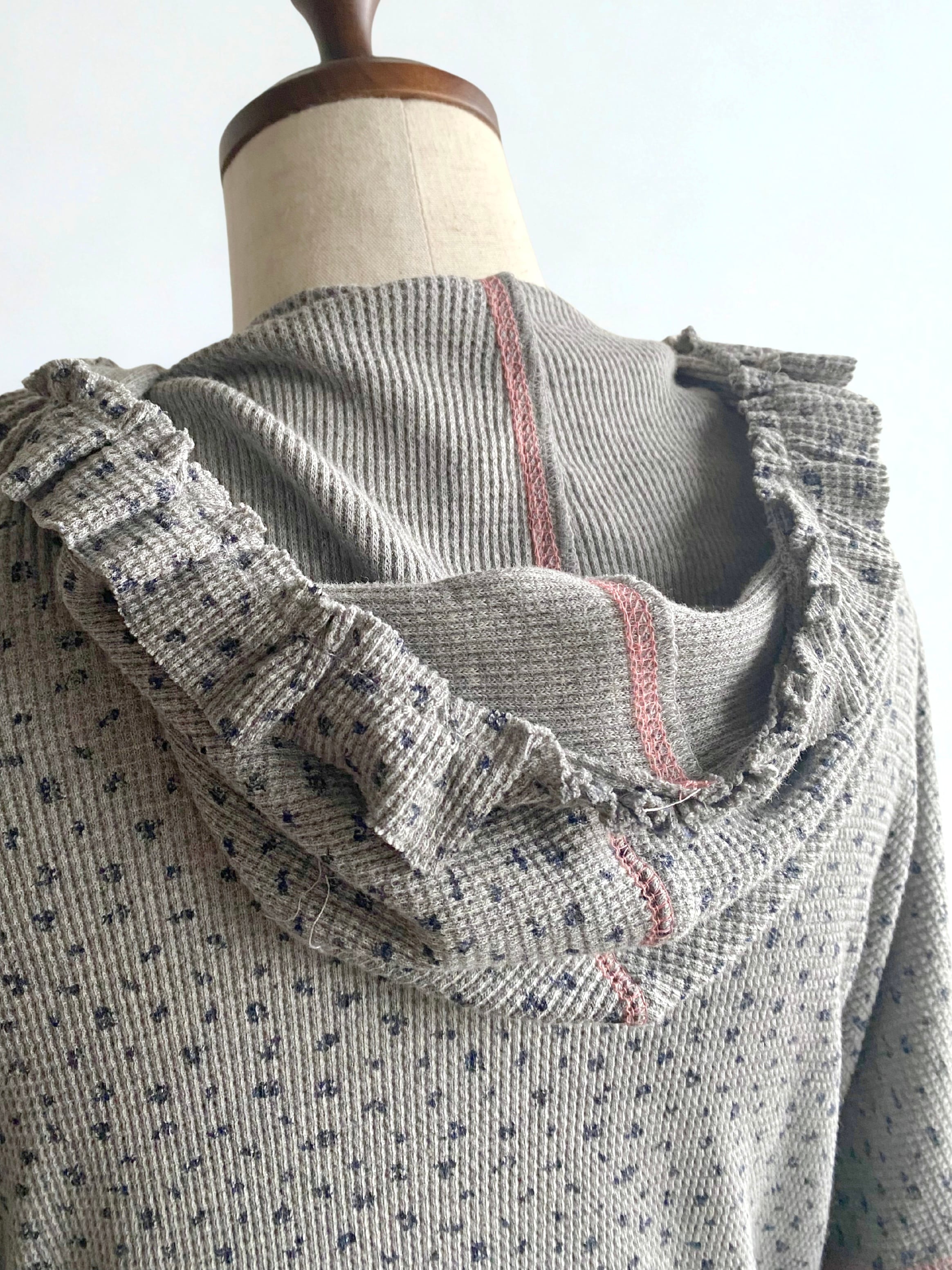 カジュアルな素材にフーディーとつながる前身にフリルをつけ、甘さのあるデザインに。