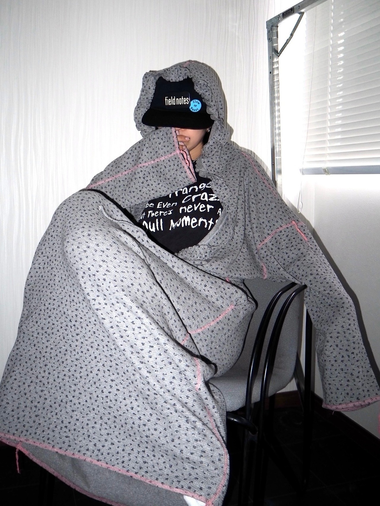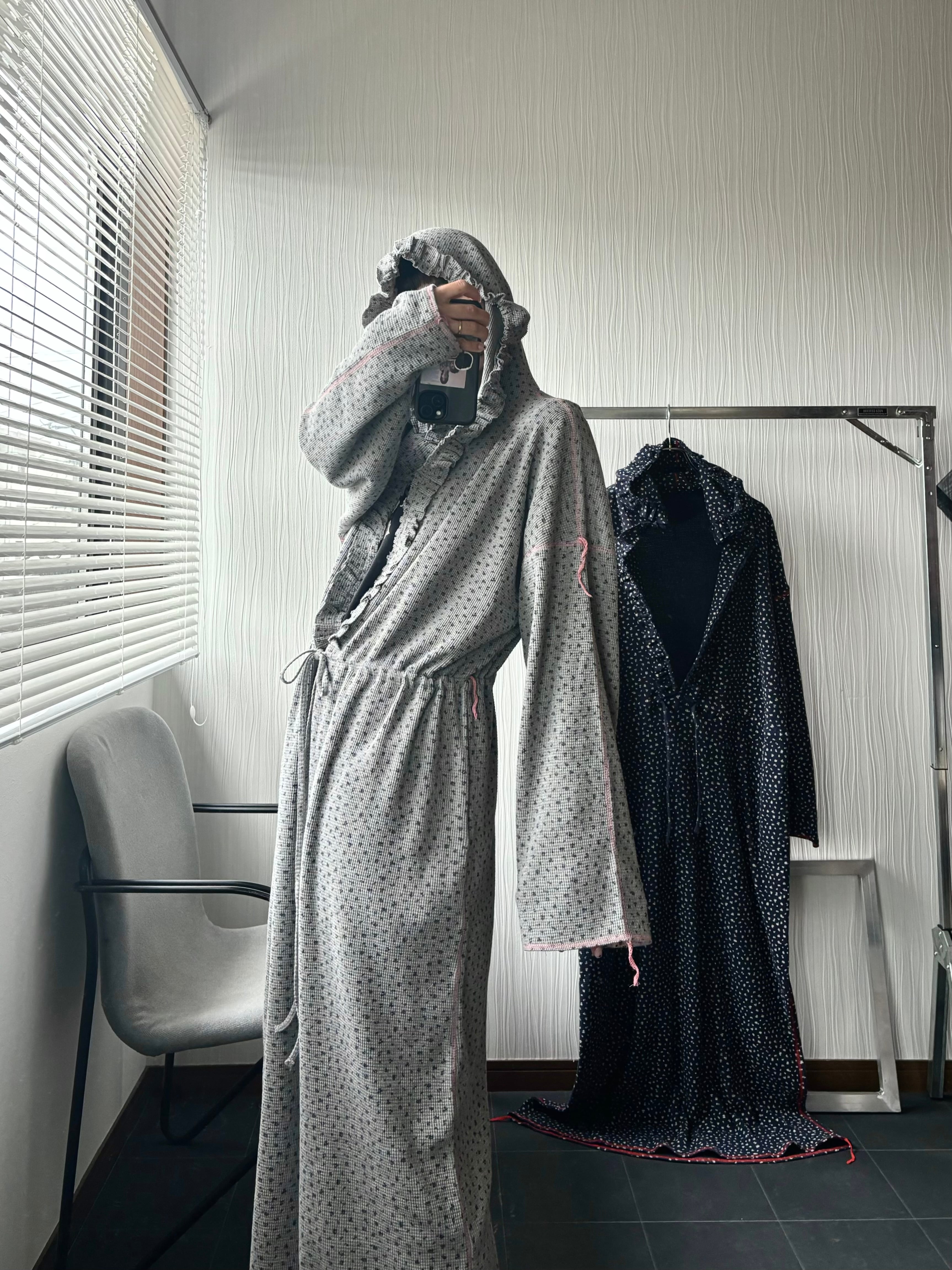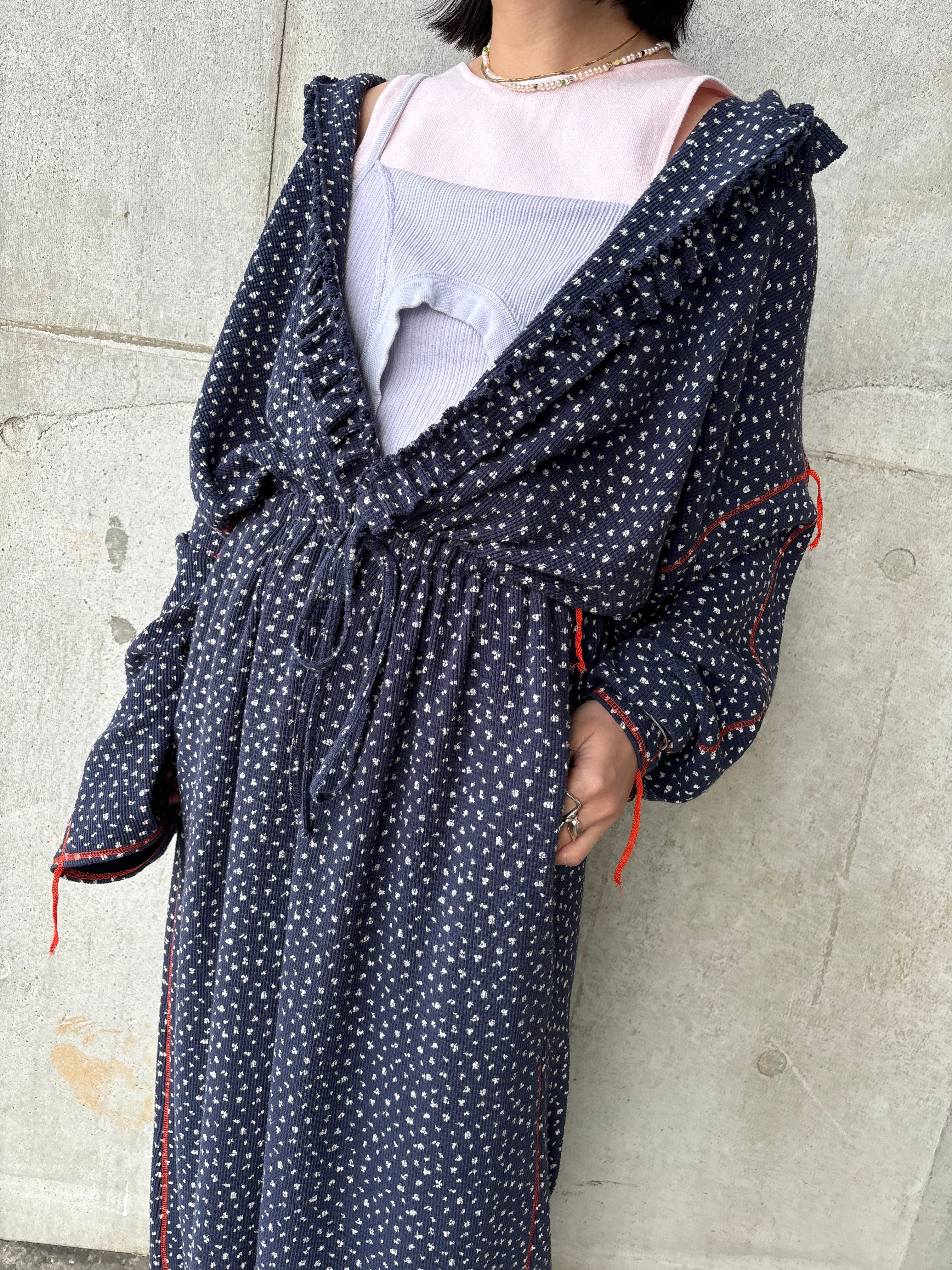 カジュアルな素材にフーディーとつながる前身にフリルをつけ、甘さのあるデザインに。
