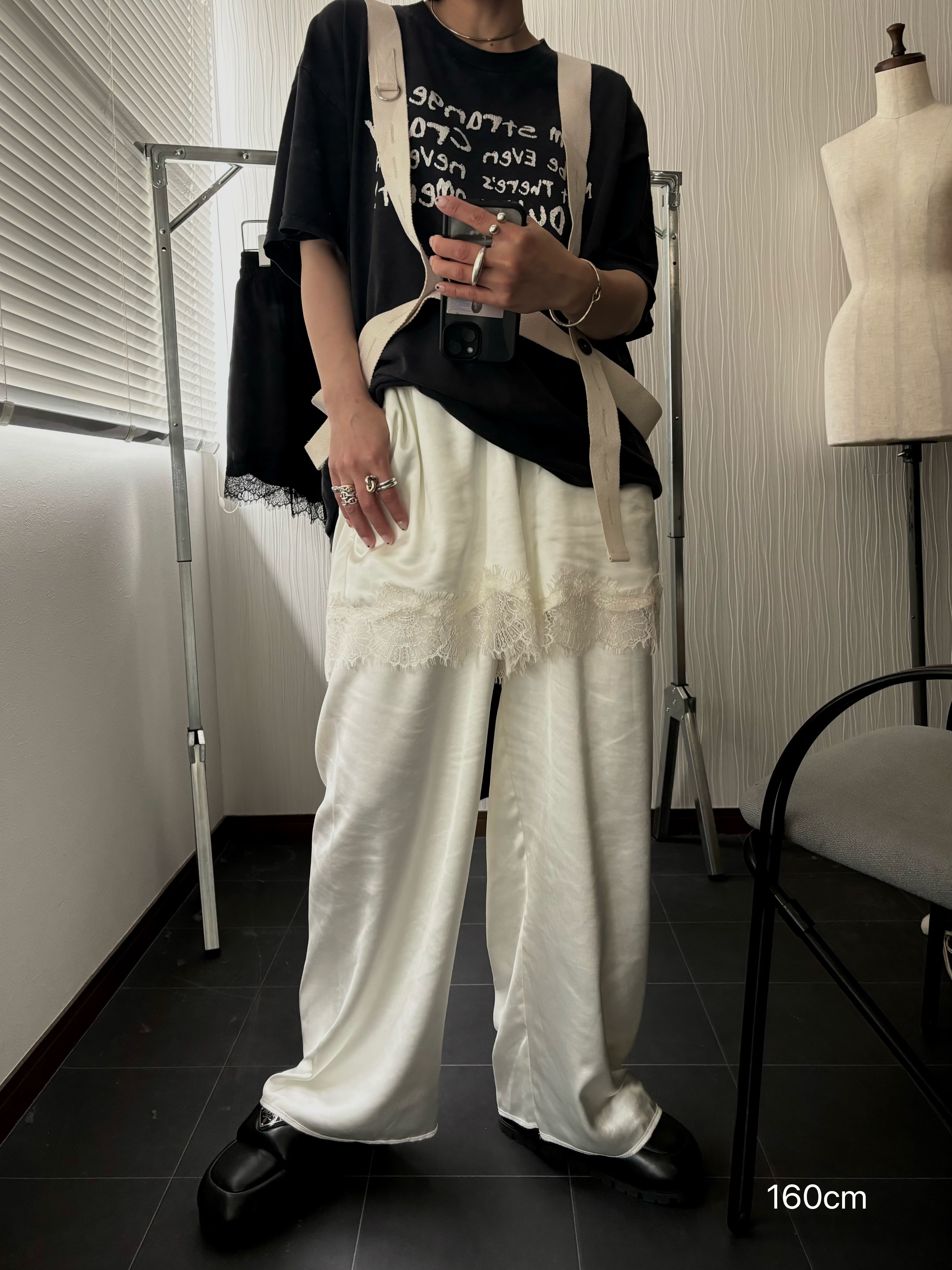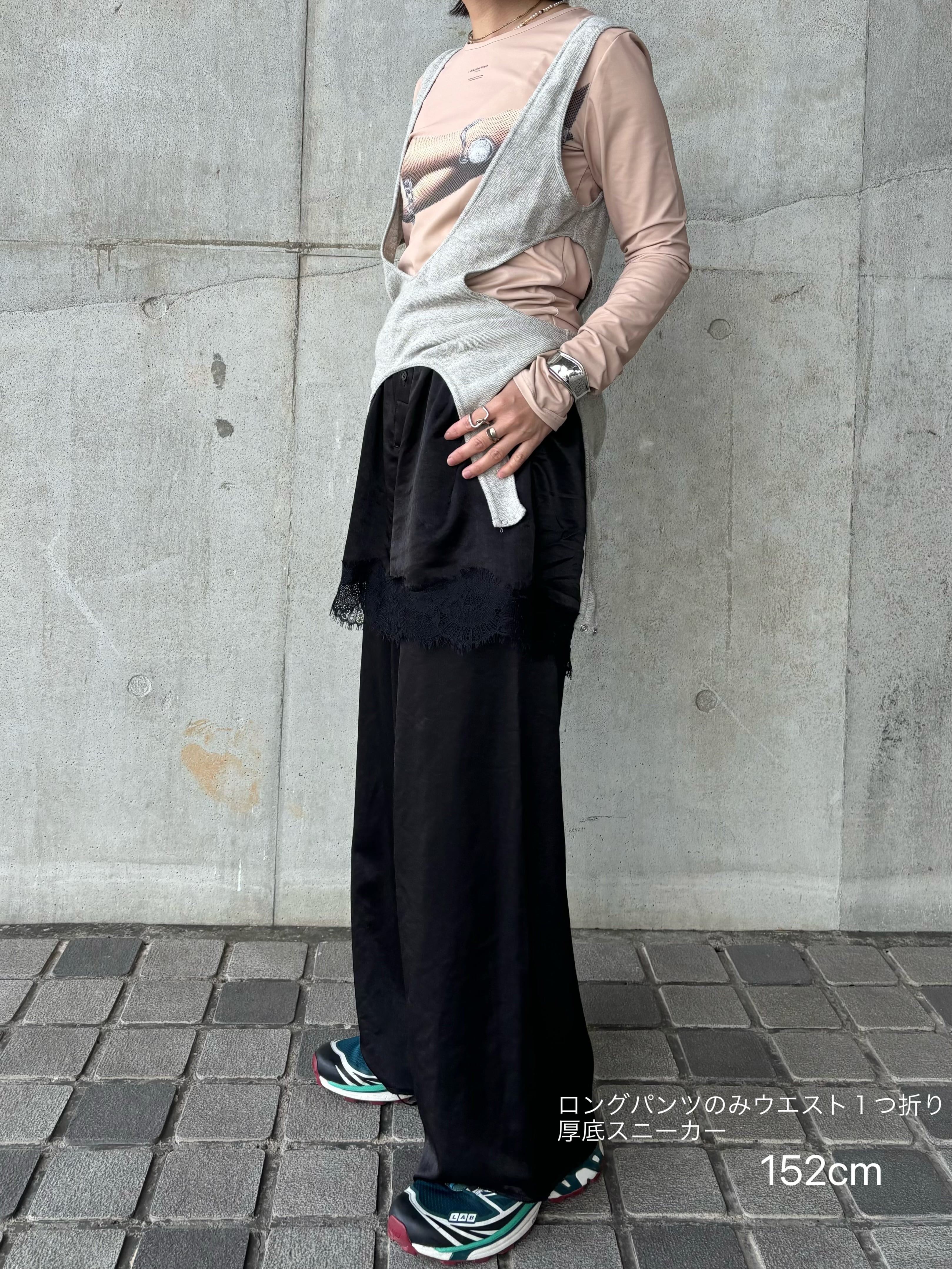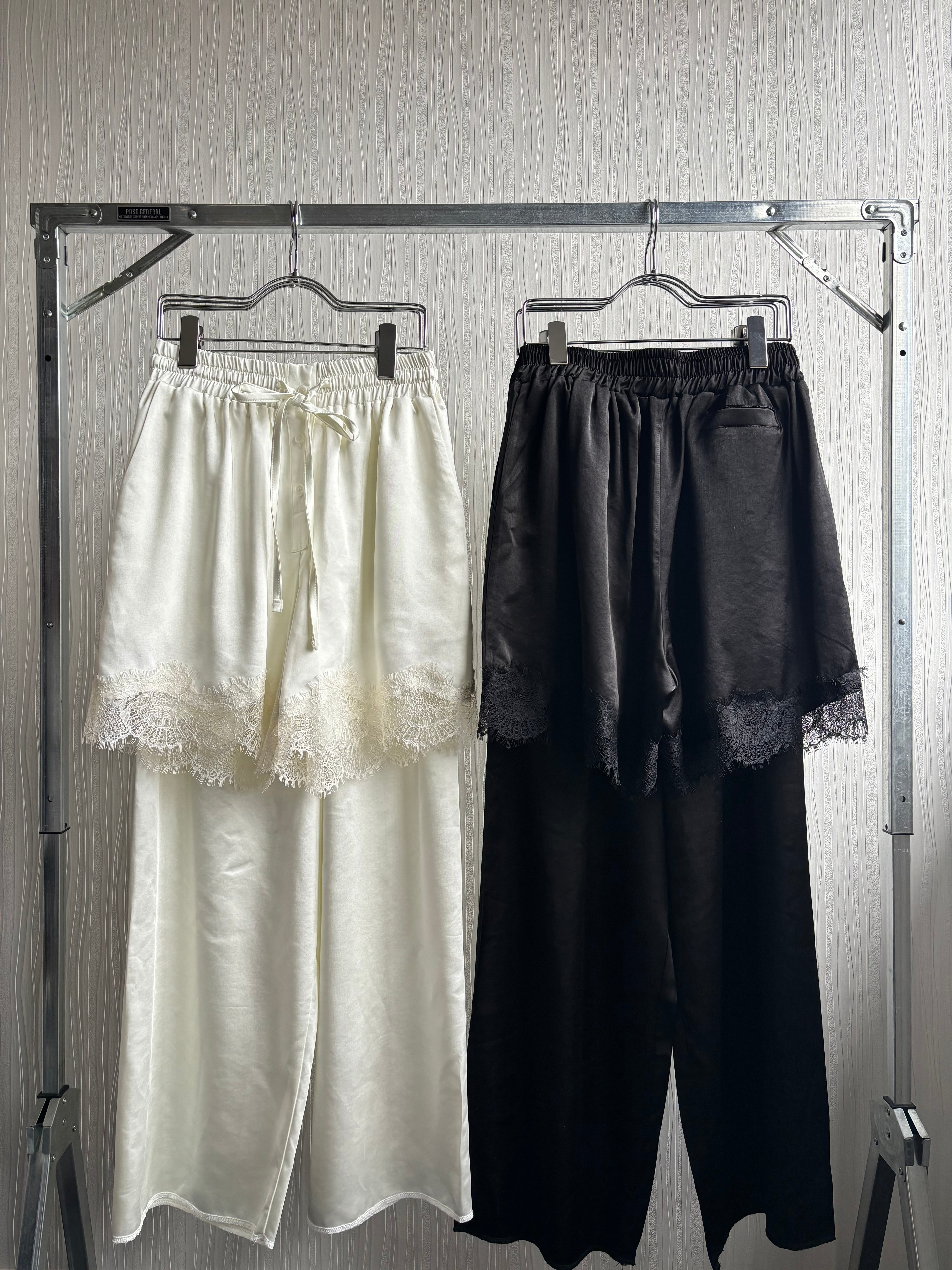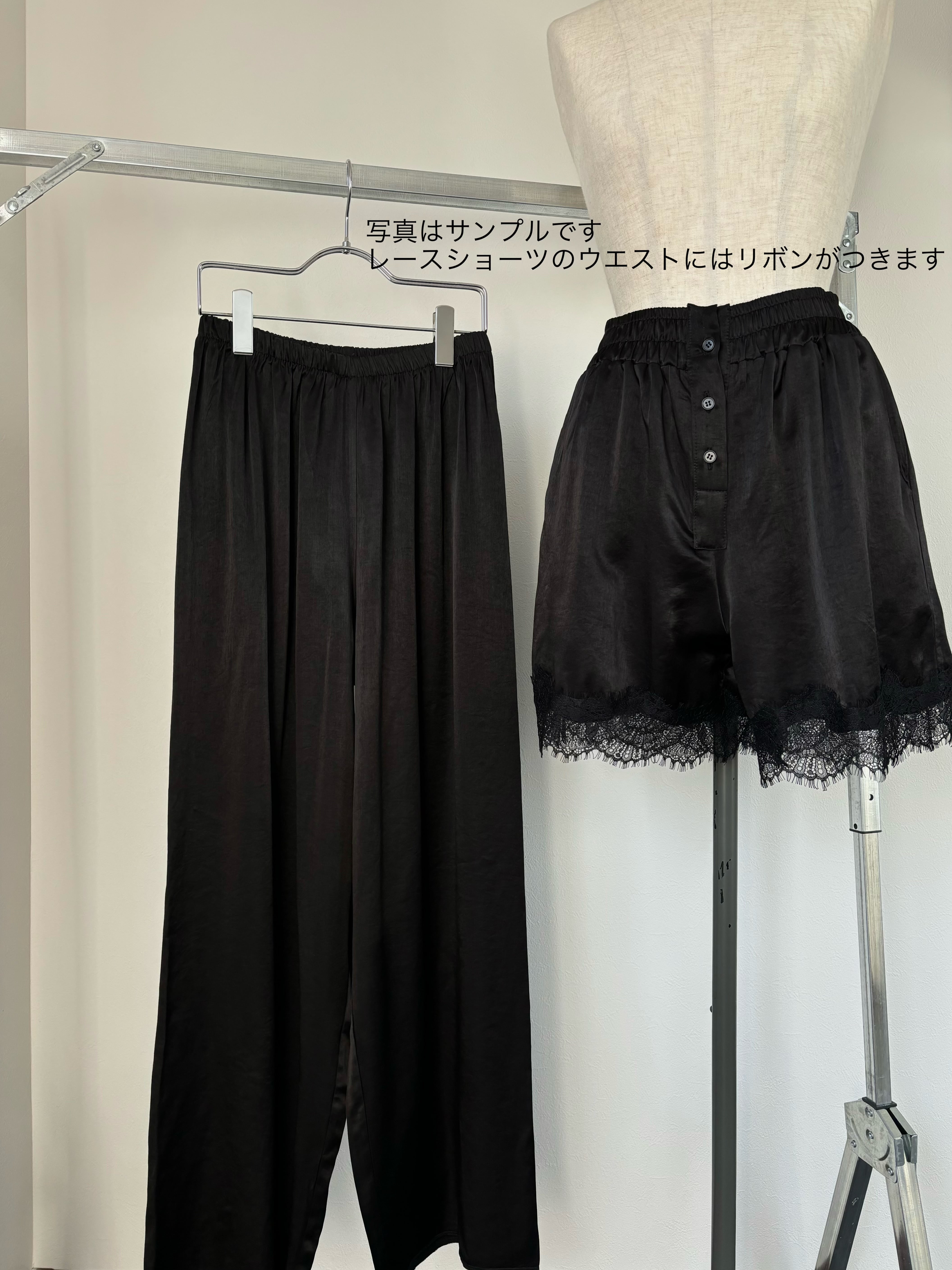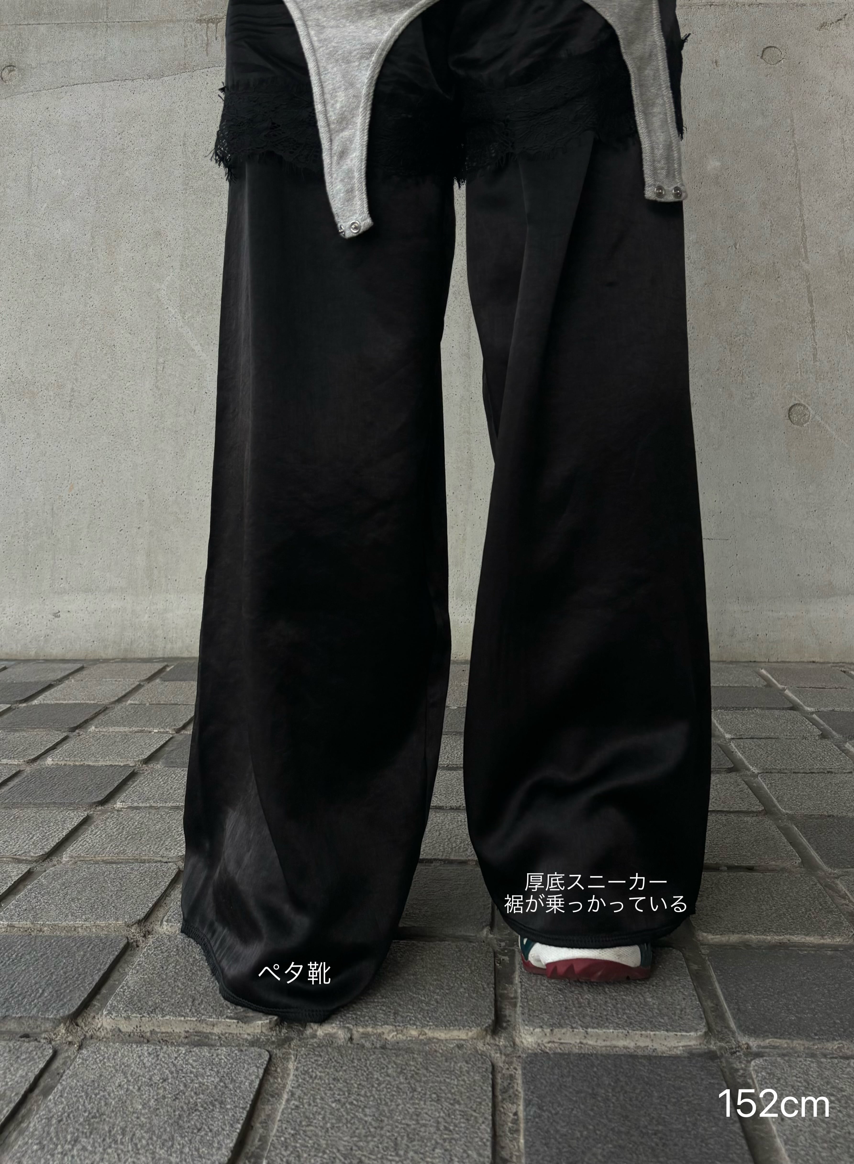 サテン素材のレース付きのショートパンツとロングパンツをレイヤードしたデザインが特徴のパンツです。
